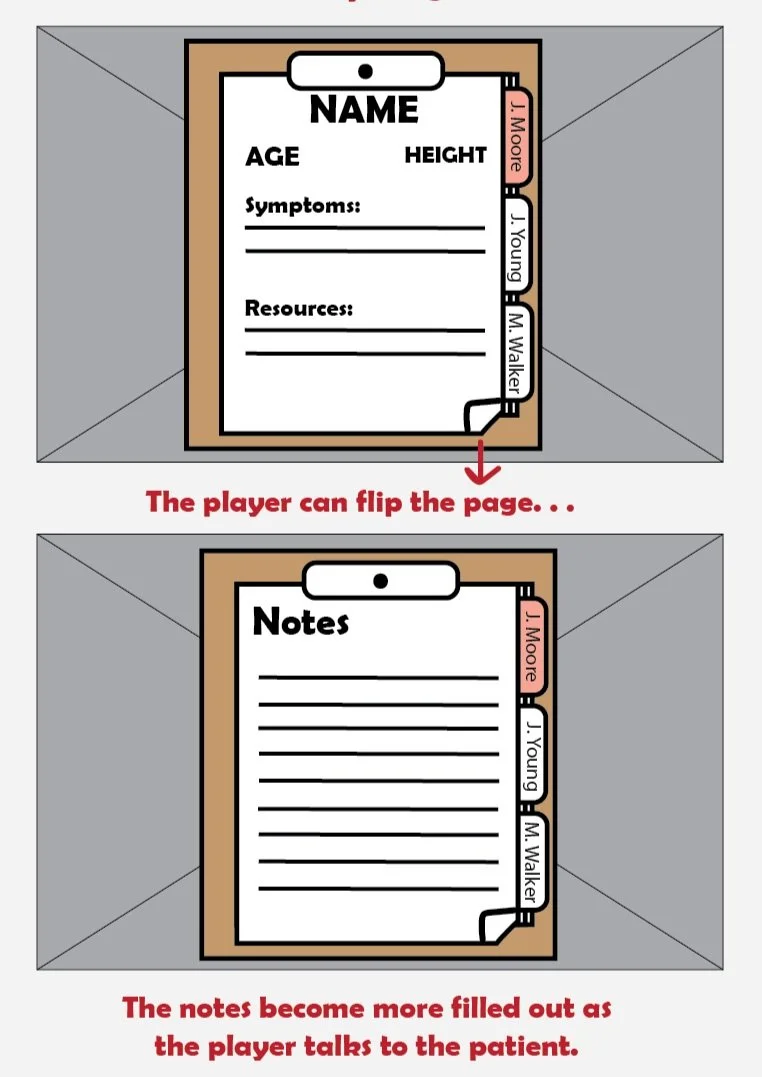 The clipboard serves as a tool to communicate each patient’s information and provides a way for players to track their symptoms throughout the diagnosis process.